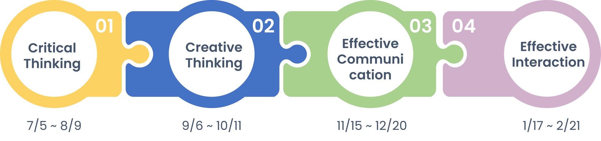 4つのコンピテンシーから構成される4つのプログラムをご用意しております。全プログラムの受講はもちろんのこと、ご希望のプログラムを個別に受講することもできます。社会人や学生の方でも参加しやすいように、平日(火曜日)の夜の時間帯(19時~20時半)にオンライン形式で開催します。