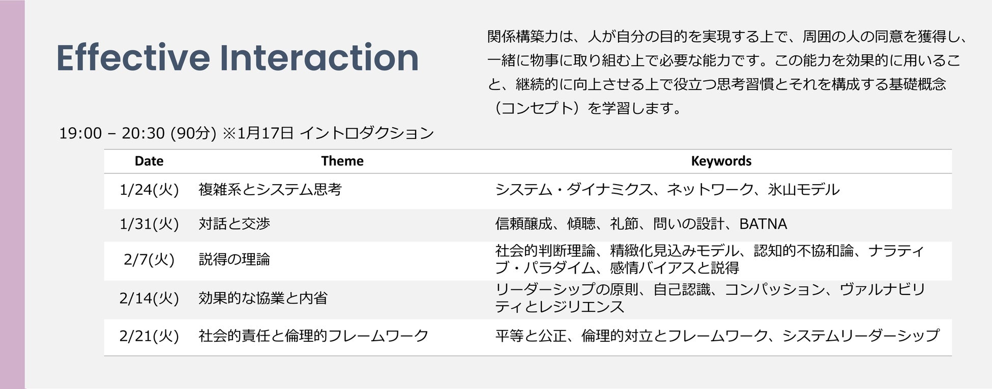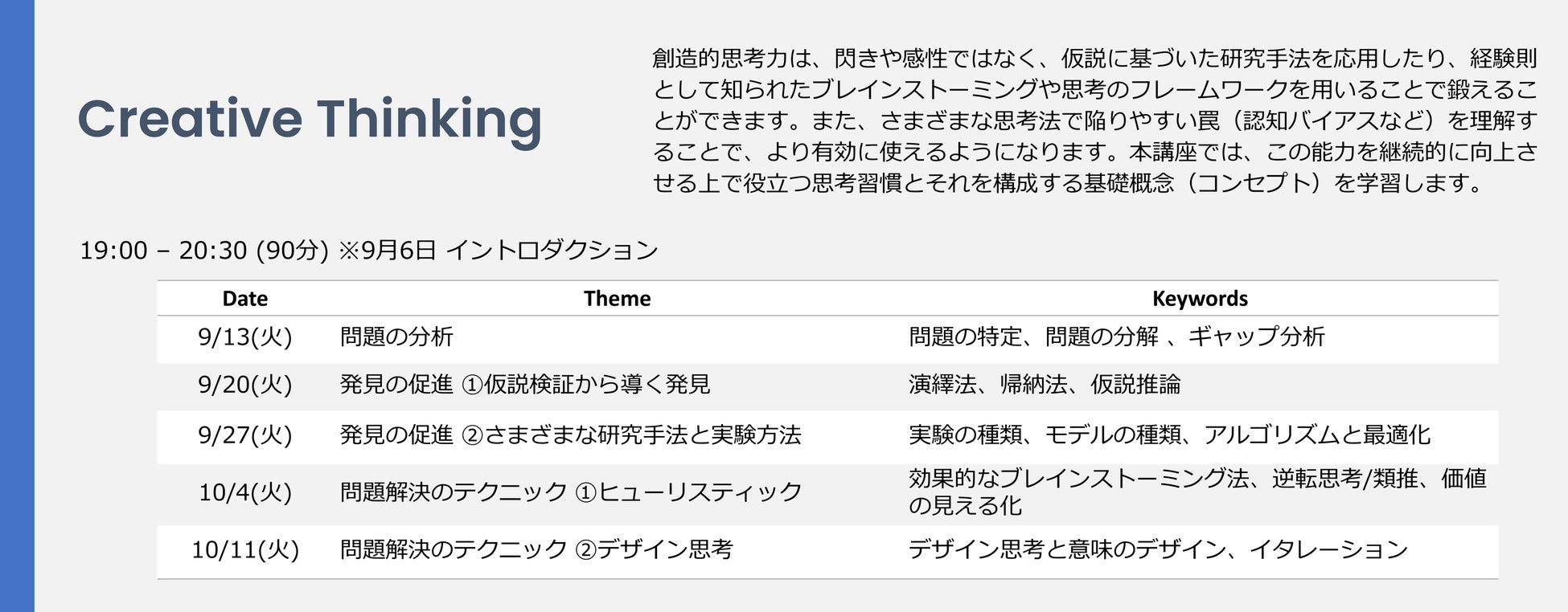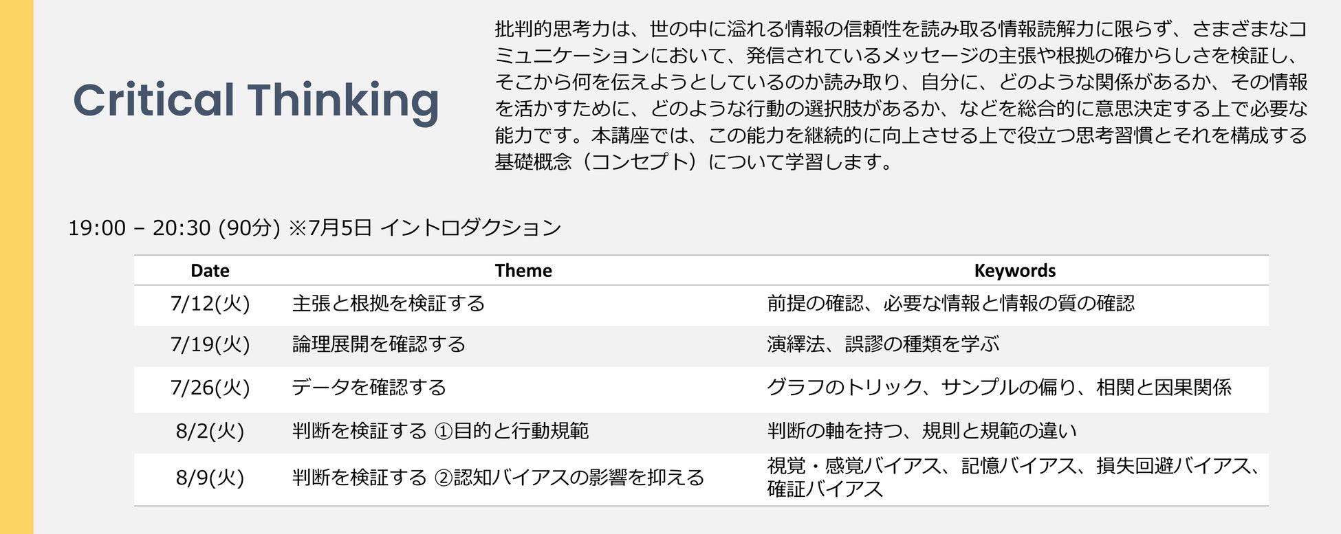 本プログラムは世界中から注目されているミネルバ大学のカリキュラムを参考に日本の社会人や学生向けにアレンジし、リーダーとして必要な「思考力」を磨きます。ミネルバ大学が提唱する、認知科学に基づいた、思考習慣と基礎概念によって構成される