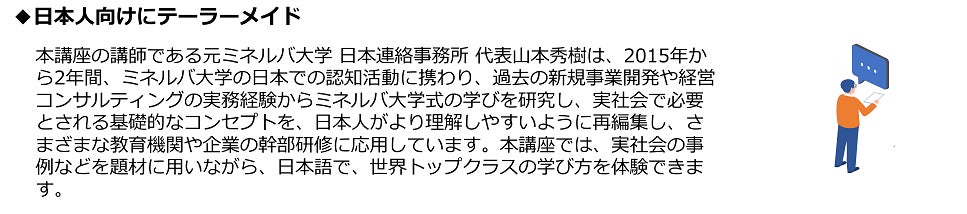 B Lab( https://blaboratory.org/ )と連携して実施する本プログラムは、世界中から注目を集めるミネルバ大学の教育メソッドを取り入れ、元ミネルバ大学日本連絡事務所代表山本氏を講師に、未来を主体的に切り拓く次世代のリーダーに不可欠である、未知の状況を想定し、適切な意思決定やコミュニケーションをとり、行動を起こす「思考習慣」を鍛えます。