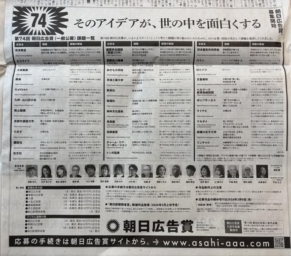 第74回 朝日広告賞〈一般公募〉課題一覧が今朝の朝刊に掲載されていますね。