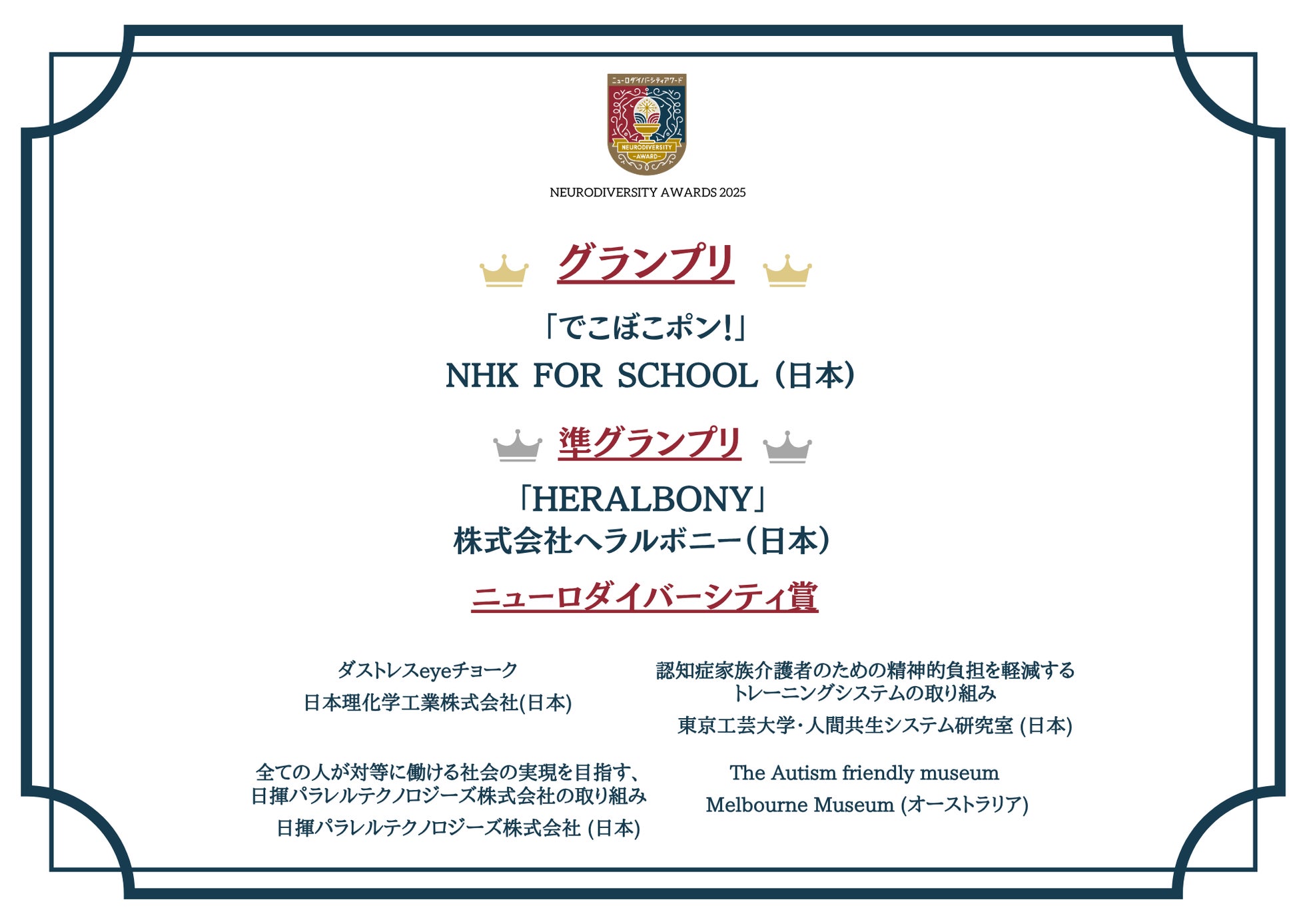 - 【プレスリリース】第2回ニューロダイバーシティアワードグランプリにNHK for School「でこぼこポン!」準グランプリに「HERALBONY」