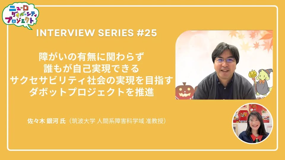 ニューロダイバーシティインタビューシリーズ第25弾は、筑波大学人間系障害科学域准教授 佐々木銀河氏の取り組み、「障がいの有無に関わらず誰もが自己実現できるサクセサビリティ社会の実現を目指すダボットプロジェクトを推進」です。