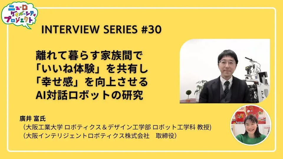 ニューロダイバーシティインタビューシリーズ第30弾は、大阪工業大学ロボティクス&デザイン工学部ロボット工学科教授廣井富氏の取り組み、「離れて暮らす家族間で「いいね体験」を共有し「幸せ感」を向上させるAI対話ロボットの研究」です。